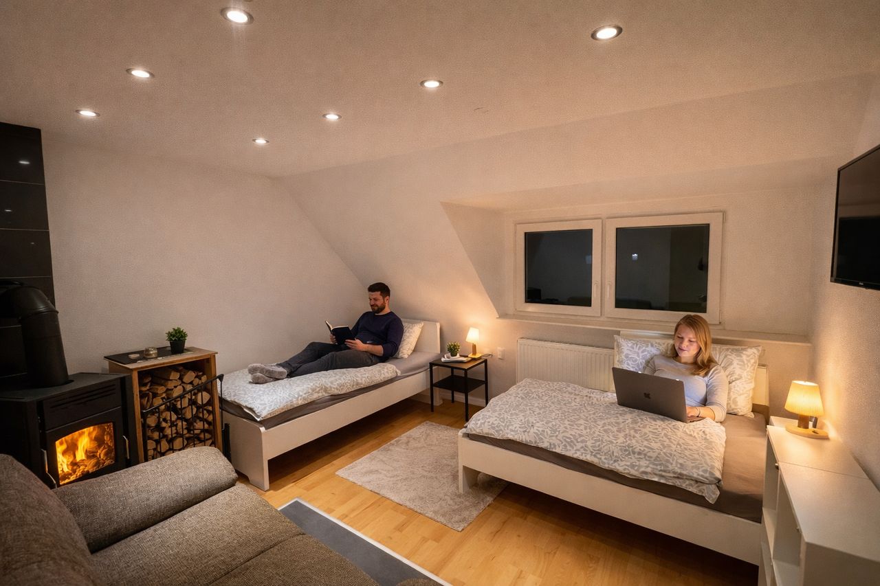 THE APARTMENT This bright 45 sqm top-floor apartment is ideally suited for teams or larger groups. It features a modern interior and a cozy atmosphere combined with high functionality. ROOMS & FEATURES BEDROOMS: A total of 5 comfortable single beds spread across two rooms provide maximum flexibility and privacy. KITCHEN: Fully equipped built-in kitchen including stove, oven, fridge, and all necessary utensils for self-catering. An integrated dining area is also provided. BATHROOM: Well-maint...
